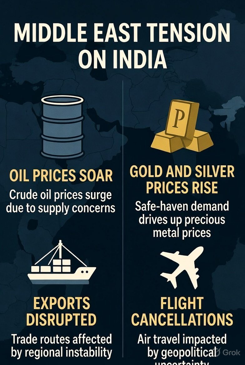 मिडिल ईस्ट तनाव से भारत पर गहरा असर : तेल आपूर्ति खतरे में, सोना-चांदी में उछाल, एक्सपोर्ट और उड़ानें प्रभावित