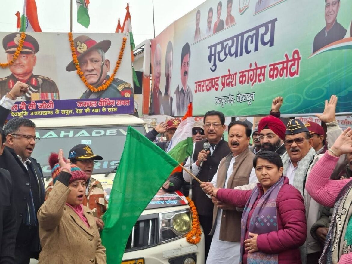 देहरादून: उत्तराखंड प्रदेश कांग्रेस के पूर्व सैनिक विभाग द्वारा अग्निपथ और अग्निवीर योजना के खिलाफ चलाई जा रही जन जागरण यात्रा के दूसरे चरण की शुरुआत आज प्रदेश कांग्रेस मुख्यालय राजीव भवन से हुई। कांग्रेस वर्किंग कमिटी (सीडब्ल्यूसी) सदस्य एवं पूर्व प्रदेश अध्यक्ष करण माहरा ने यात्रा को हरी झंडी दिखाकर रवाना किया।