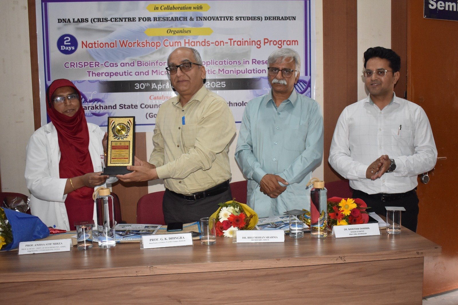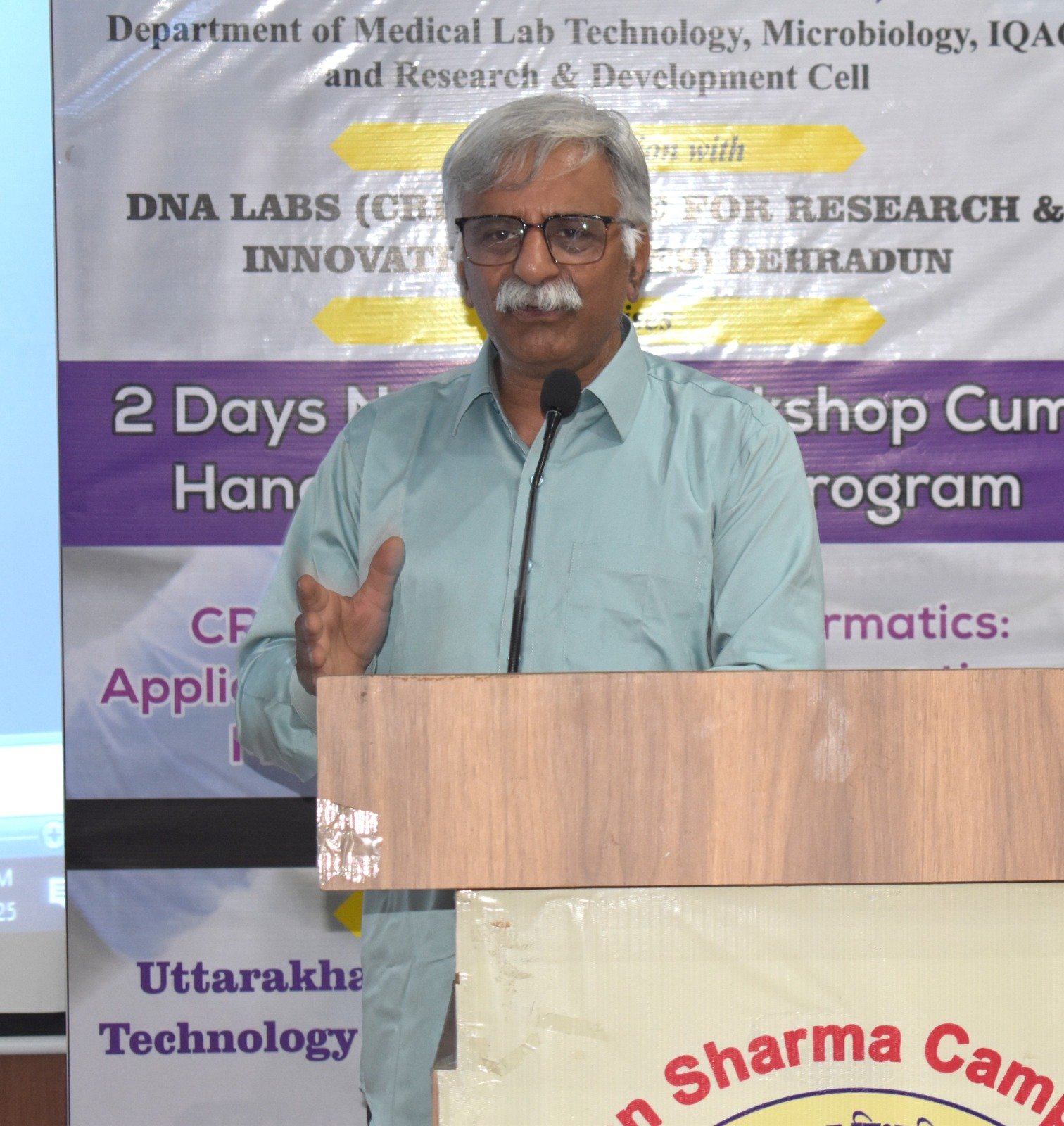 इस अवसर पर कार्यवाहक निदेशक व विज्ञान संकायाध्यक्ष प्रो. गुलशन कुमार ढींगरा ने सभी अतिथियों का स्वागत किया तथा इस कार्यशाला के उद्देश्य के बारे में जानकारी देते हुए कहा कि यह कार्यशाला एम एल टी, माइक्रोबायोलॉजी विभाग, अनुसंधान एवं विकास प्रकोष्ठ तथा आइ.क्यू.ए.सी सेल के बैनर तले आयोजित किया जा रहा है तथा इसमें CRISPR cas तकनीकि से अनुसंधान में जैव सूचना विज्ञान का अनुप्रयोग व सूक्ष्मजीवों में आनुवंशिक दोषों का निवारण के बारे में बताया जायेगा, उन्होंने बताया कि डीएनए लैब्स, देहरादून के सहयोग से हमारे परिसर में यह पांचवी कार्यशाला का आयोजन किया जा रहा है जिसमें देश के विभिन्न स्थानों से प्रतिभागी प्रतिभाग कर रहे है I