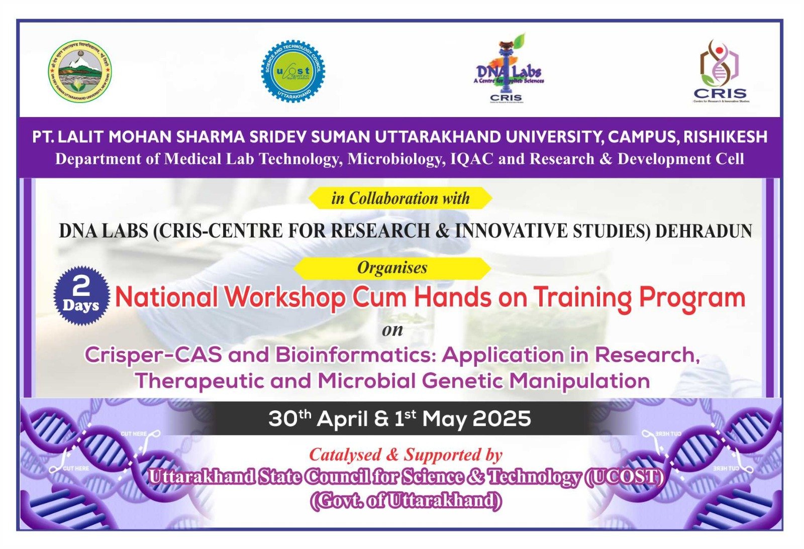 ऋषिकेश : पंडित ललित मोहन शर्मा परिसर ऋषिकेश के मेडिकल लैब टेक्नोलॉजी विभाग, उत्तराखंड राज्य विज्ञान एवं प्रोधौगिकी परिषद (यूकास्ट) व डी.एन.ए. लैब्स देहरादून के संयुक्त तत्वाधान में “CRISPR cas एवं बायोइनफॉर्मेटिक्स एप्लीकेशन इन रिसर्च थैरेपीयूटिक : माइक्रोबॉयल जेनेटिक मैनिपुलेशन” चिकित्सीय विषय पर दो दिवसीय राष्ट्रीय कार्यशाला एवं हैंड्स ऑन ट्रेनिंग आरम्भ हुई l